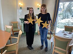 Bild (v.l.n.r.): Kathleen Rabe (DEHOGA Sachsen) und Nicole Tüchert (Hotel Am Kunnerstein) im Kaminzimmer des Hotels