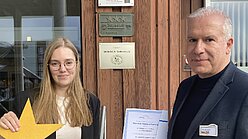 Bild: Kathleen Rabe (DEHOGA Sachsen, links im Bild) und Antoni Knobloch (Regionaldirektor AHORN Hotels & Resorts in Oberwiesenthal, rechts im Bild) vor dem Eingang des Hotels
