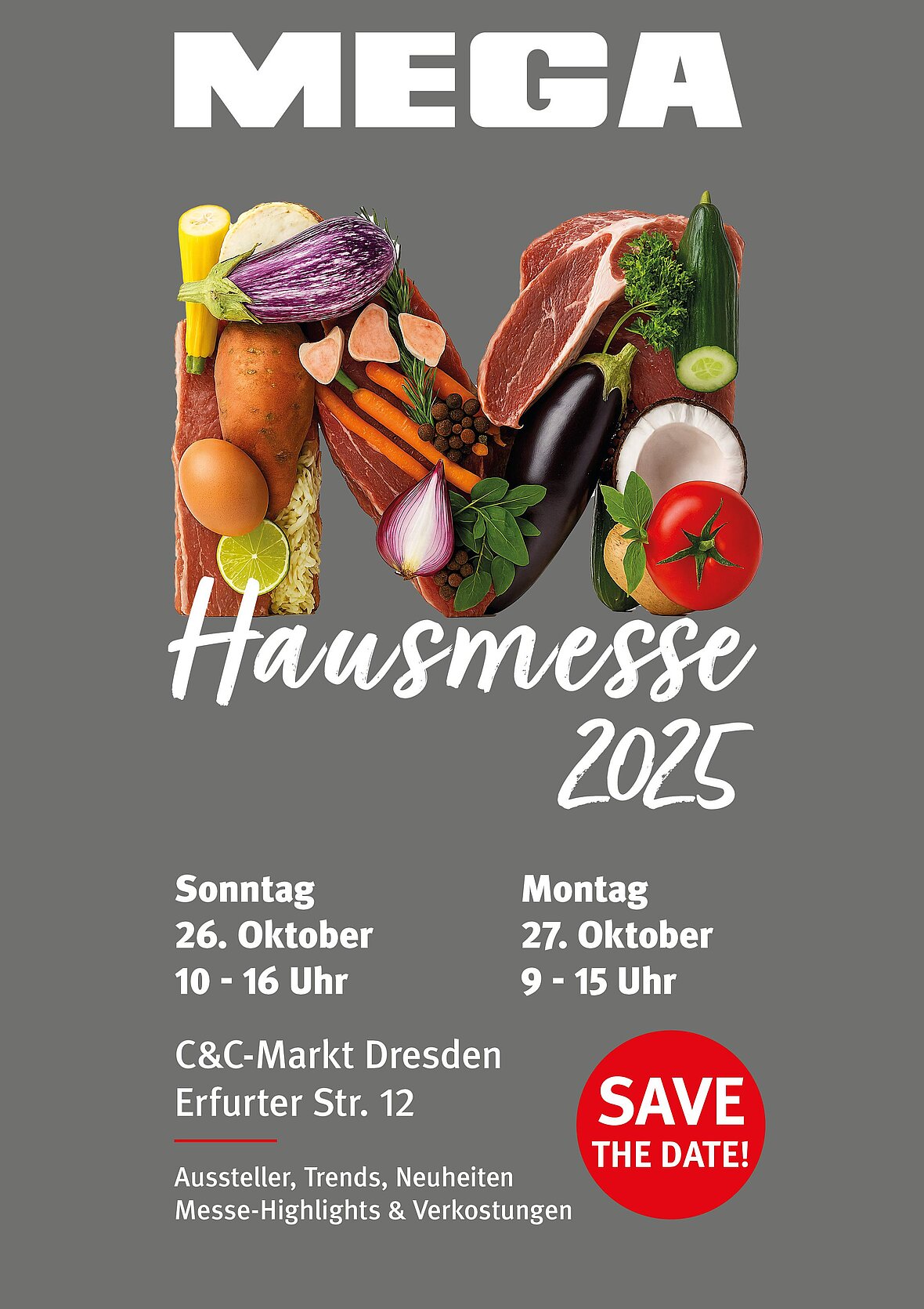 Am So. 26. Oktober 2025 (10 – 16 Uhr) und Mo. 27. Oktober 2025 (9 – 15 Uhr) lädt die MEGA Das Fach-Zentrum für die Fleischerei und Gastronomie herzlich zur Hausmesse ein.
